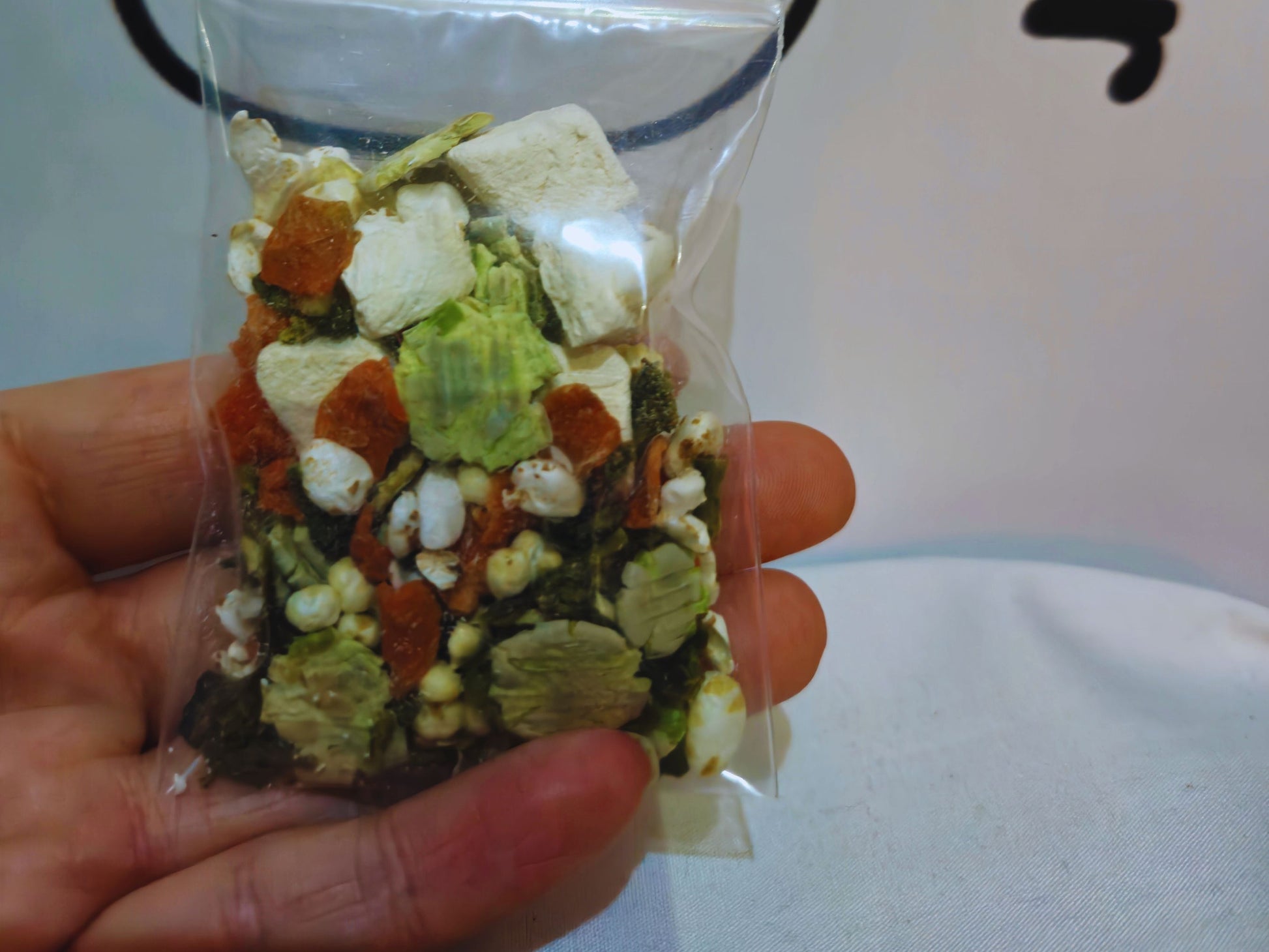 this mix includes dried vegetables (organic broccoli and organic carrot), puffed grains, pea flakes, and freeze-dried chicken (or you can opt for a nut roast-inspired vegetarian option with walnuts and hazelnuts). When you open it, it really does smell like a roast dinner!