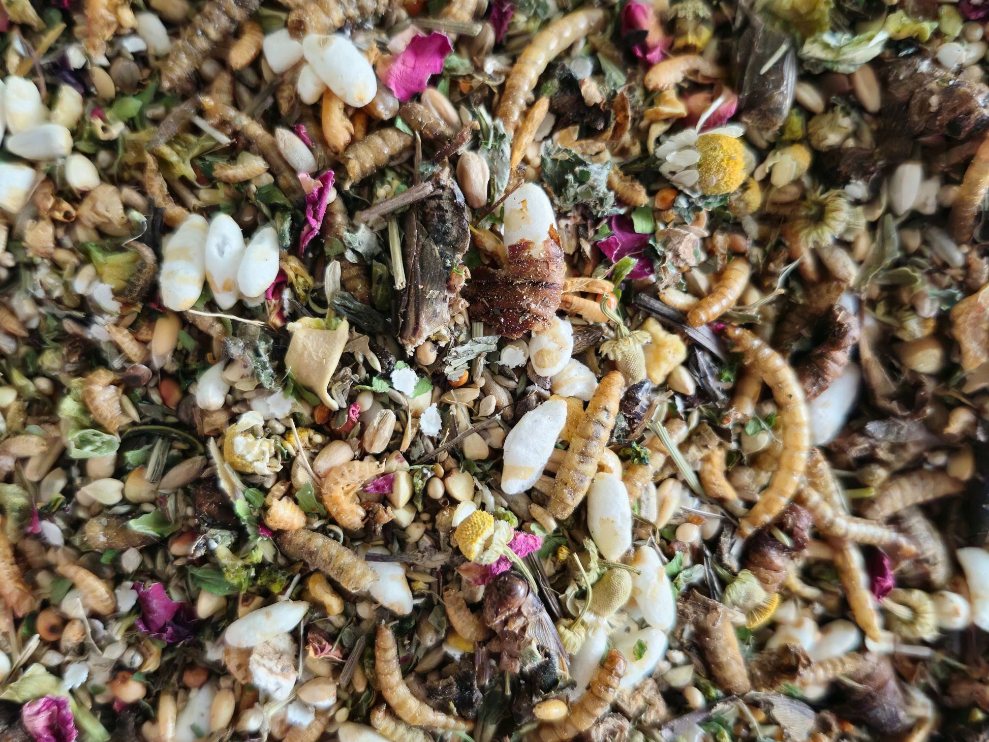 Organic oat groats, Mixed millet (red, yellow, Japanese), Organic buckwheat, Organic barley, Organic amaranth, Dried crickets, Silkworm pupae, Organic rye grain, Dried broccoli, Dandelion leaf, Red dari, Hemp seeds, Dried courgette, Organic spelt, Wheat, Gammarus shrimp, Plantain leaf, Black soldier fly larvae, Flaked quinoa, Pagima green, Puffed brown rice, Farro, Flax seed, Mealworms, Chamomile, Milk thistle seed, Canary seed, Chicory root, Safflower seed, Walnut, Raspberry leaf, Rose petals, Parsley, Basil.