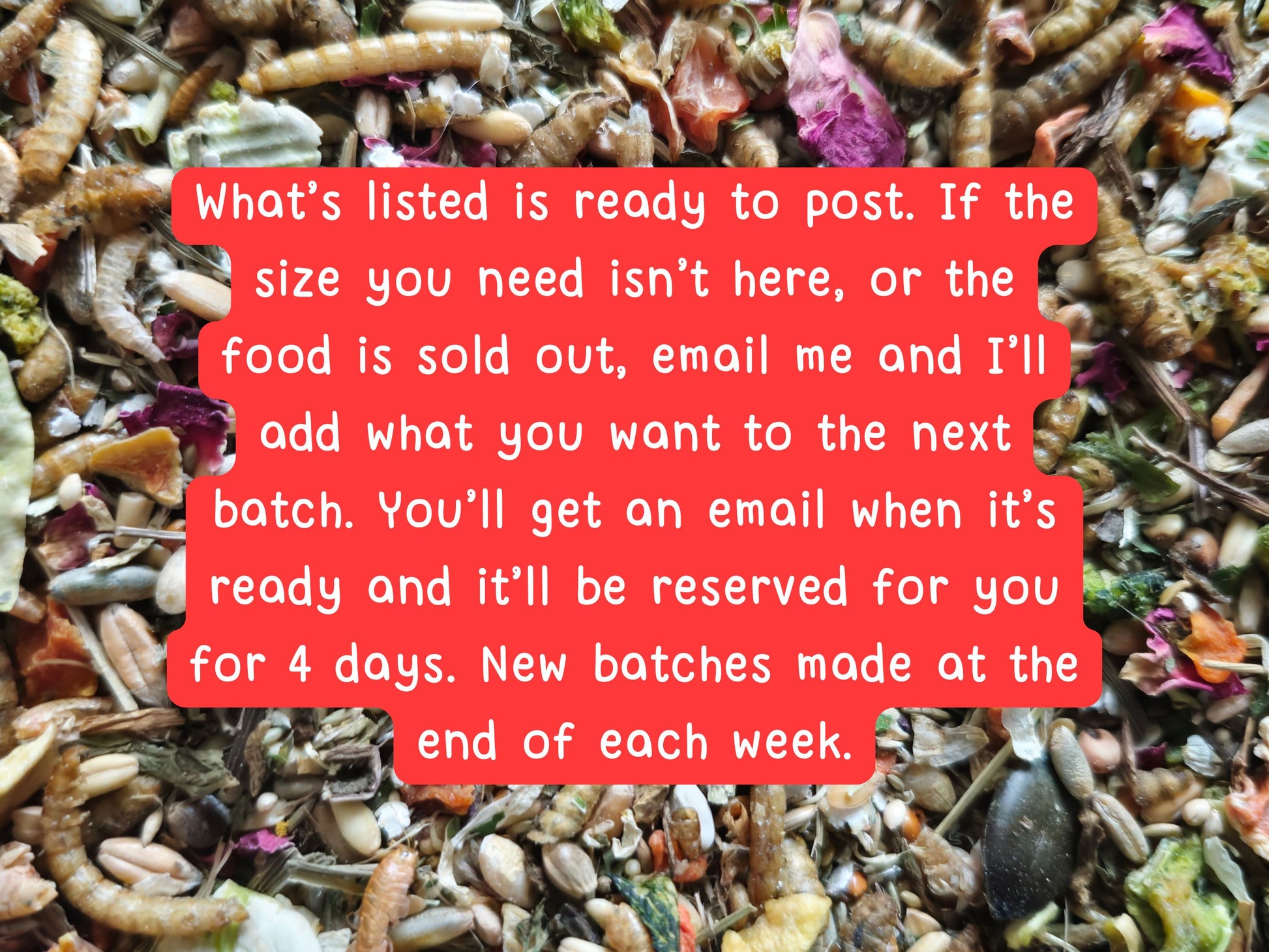 What you see is what’s ready on the shelf, when it’s gone, it’s gone until the next batch. New batches are made weekly. Need a specific size? Email me and I’ll add it to the next batch. Your hamster food mix will be reserved for 4 days once ready.