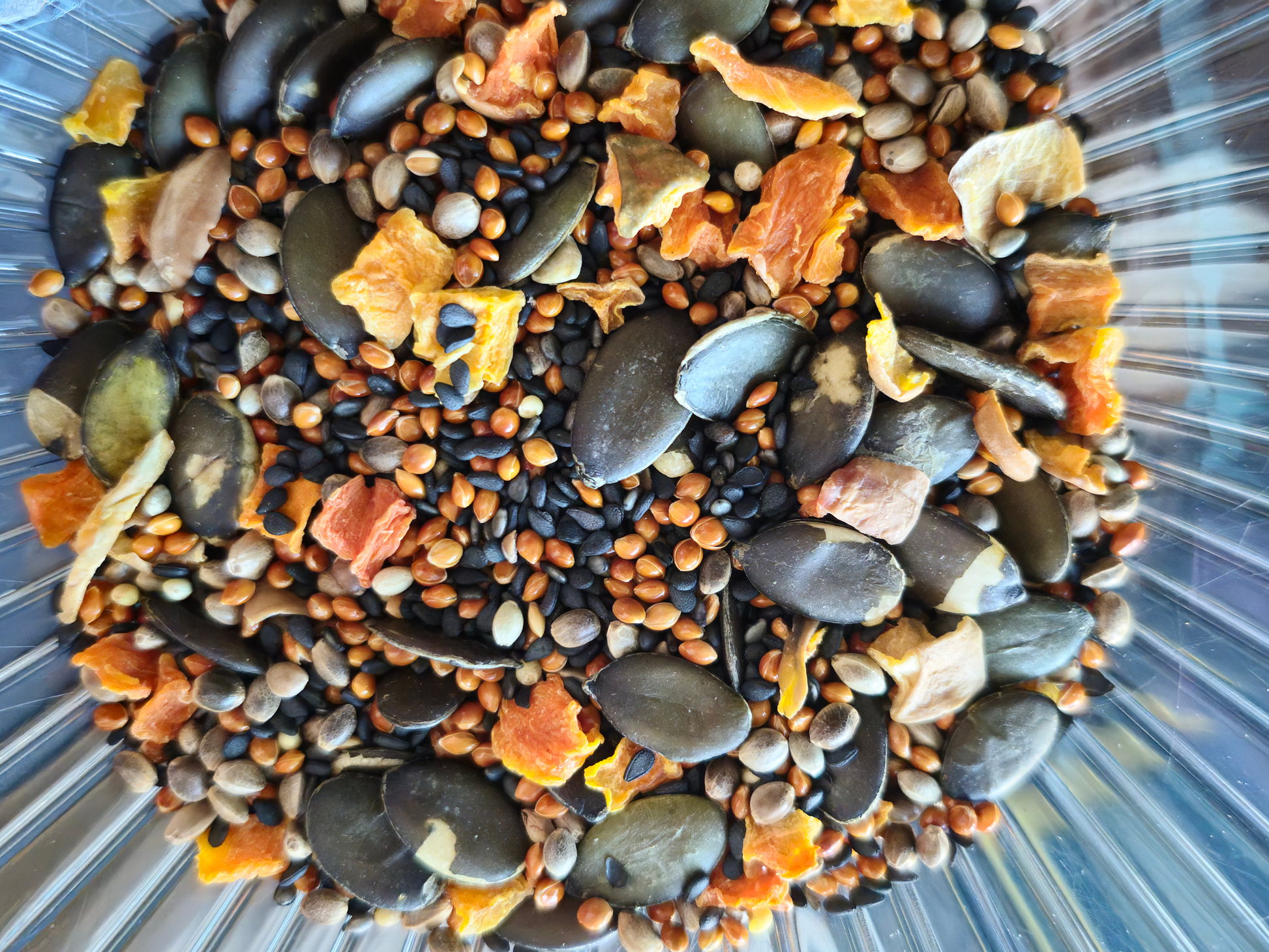 - A stick on treat mix – Pumpkin seeds, black sesame seed, sunflower seed, red millet, hemp seeds, dried pumpkin and mealworms
